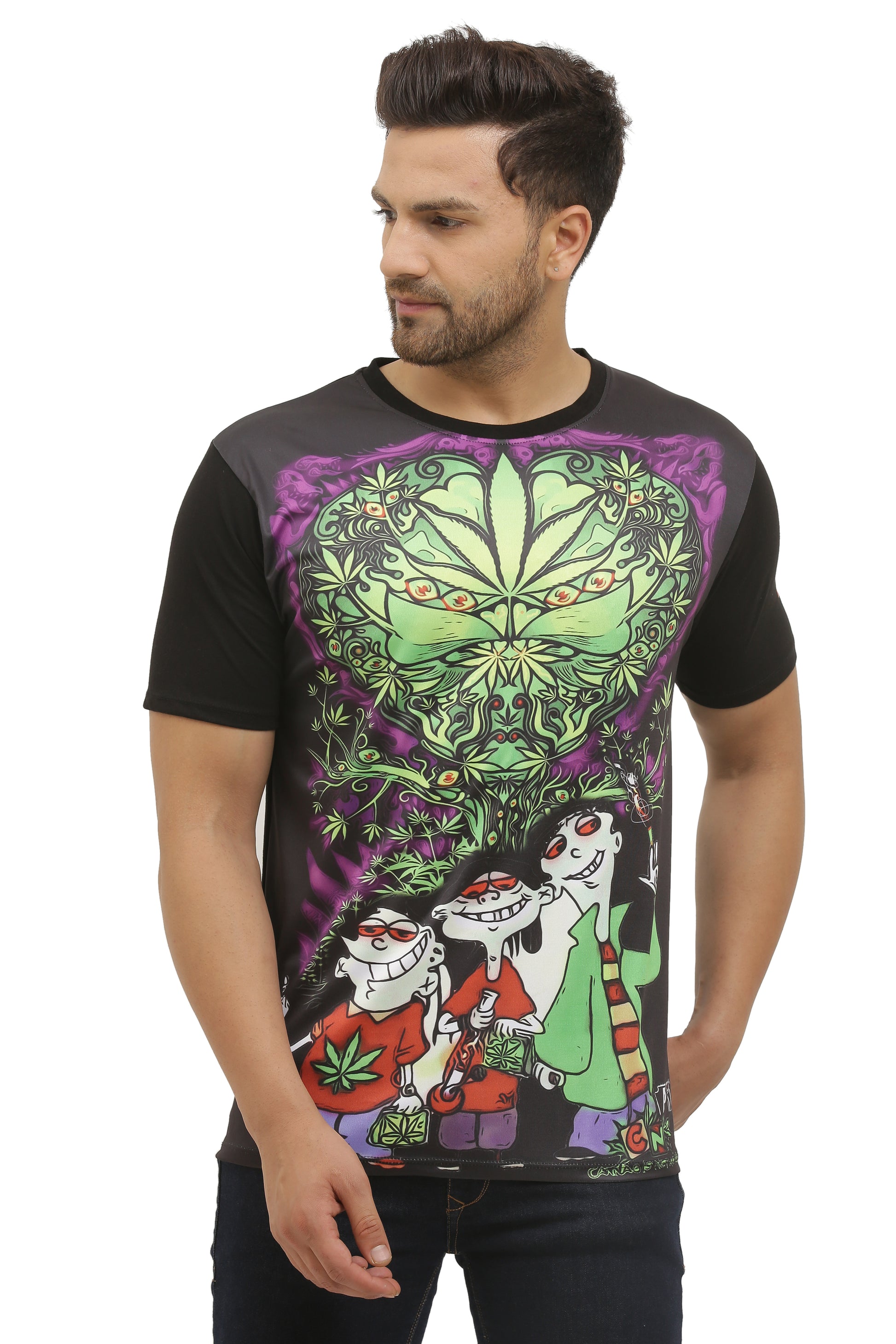 | 💨 Ed-Edd-Eddy – UV Reactive Mischief Tee Get Lost. Stay Lit. Be Psychedelically You. The legendary cartoon mischief-makers Ed, Edd & Eddy are back—but this time, they’ve crossed over to a whole new psy realm. In this bold UV reactive design by Psychedelic Insane, the trio is caught vibing with hybrid smokes, glowing red-eyed and blissed-out in a forest of mystical greens and trippy illusions. It's not just nostalgia—it's a full-blown psychedelic rebellion in cartoon form. 🎨 Design Theme Classic cartoon trio Ed-Edd-Eddy reimagined in a stoner fantasy realm Surreal jungle of psy-warped cannabis leaves, glowing eyes, and hybrid energy Design humorously reflects the bliss of zoning out and dreaming deep Perfect for 420 vibes, party nights, and bold statement wear 👕 Fabric Composition Front Fabric: 100% Dry Fit Micro Polyester (190–210 GSM) → Soft, breathable & UV reactive brilliance Sleeves & Back Fabric: 100% Bio-Washed Cotton (190–210 GSM) → Smooth comfort, durable for long party hours 🔮 Glow-Up Features Day Mode: Fun & eye-catching with vivid cartoon clarity UV Mode: Explodes with radiant greens and neon outlines RGB Mode: Comes alive under party/strobe lighting Glow in Dark: Customisable feature,to opt in kindly place order from Custom design tab. âš¡ï¸ Why You’ll Love It A fusion of pop culture, psychedelic art, and cannabis freedom Standout piece for music fests, afterparties, and stoner circles Unisex design — for the young, trippy, and unapologetically real Proudly Made in India |